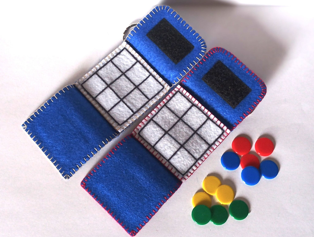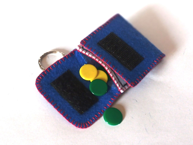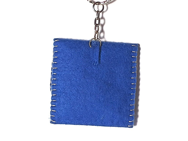 Llavero de fieltro azul cosido con hilo de colores y 6 fichas de plástico. Dimensiones cerrado: 4 x 4 cm