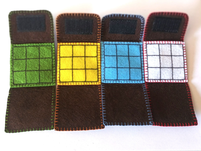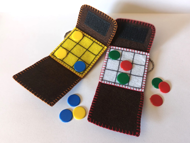 Llavero de fieltro marrón chocolate cosido con hilo de colores y 6 fichas incluidas. Dimensiones cerrado: 4 x 4 cm