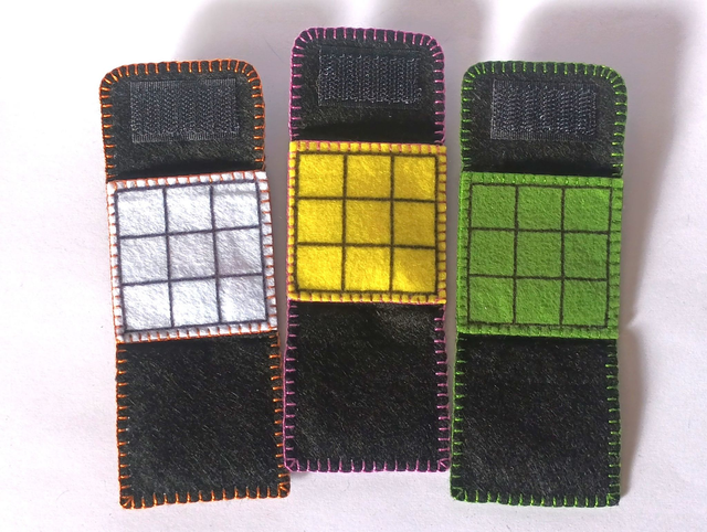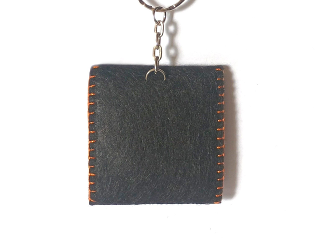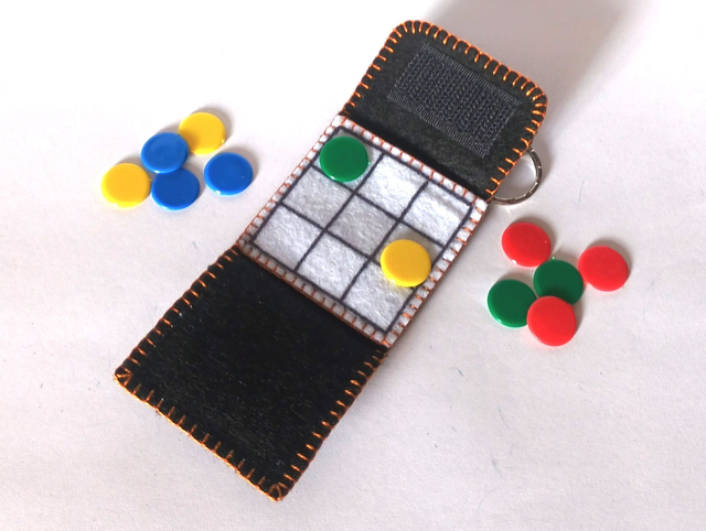 Llavero de fieltro negro cosido con hilo de colores y 6 fichas de plástico. Dimensiones cerrado: 4 x 4 cm