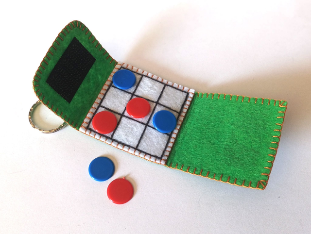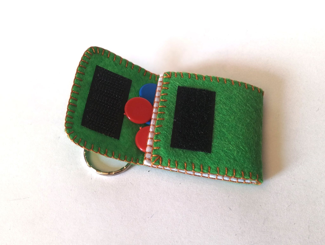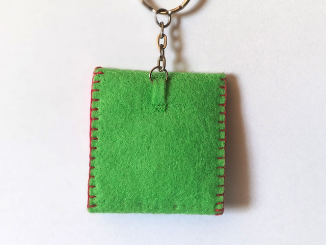 Llavero de fieltro verde cosido con hilo de colores y 6 fichas de plástico. Dimensiones cerrado: 4 x 4 cm